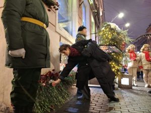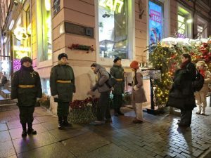 Мы у памятного знака «Блокадный репродуктор» на пересечении Невского проспекта и Малой Садовой