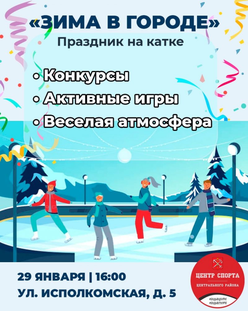 Центр спорта Центрального района приглашает жителей и гостей района на традиционное праздничное событие — «Зима в городе», которое пройдёт на катке в тёплой и по-настоящему праздничной атмосфере.