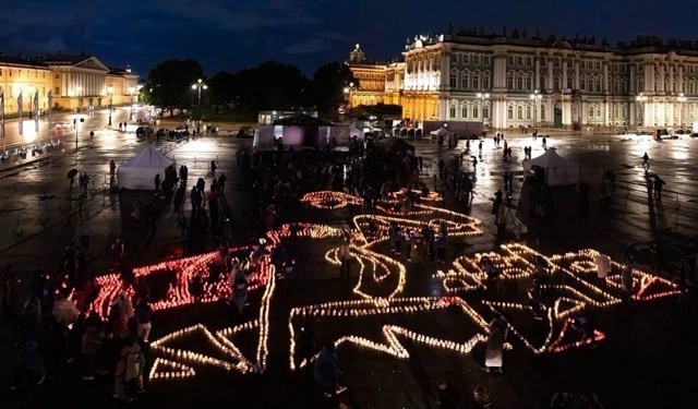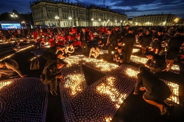 После минуты молчания в память о погибших в годы войны губернатор Александр Беглов, волонтеры, студенты и члены петербургского «Движения Первых» установили свечи в общую огненную картину на площади.