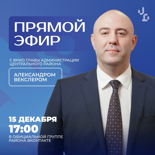 15 декабря в 17:00 состоится прямой эфир с временно исполняющим обязанности главы администрации Центрального района Санкт-Петербурга Александром Векслером.