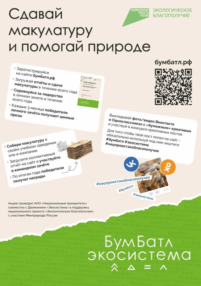 «БумБатл» — это Всероссийская акция по сбору макулатуры в поддержку национального проекта «Экологическое благополучие», который реализуется по решению Президента.